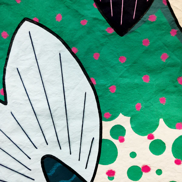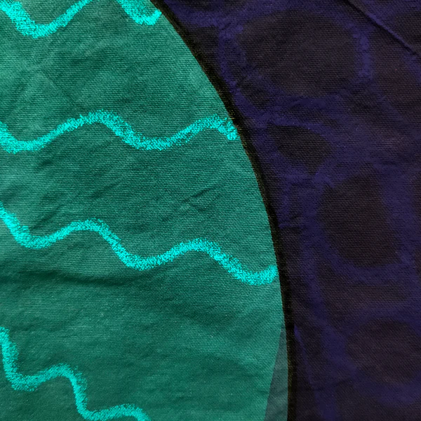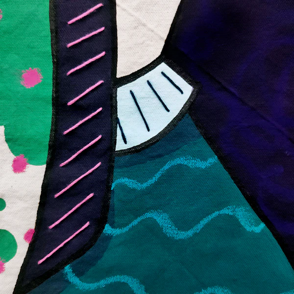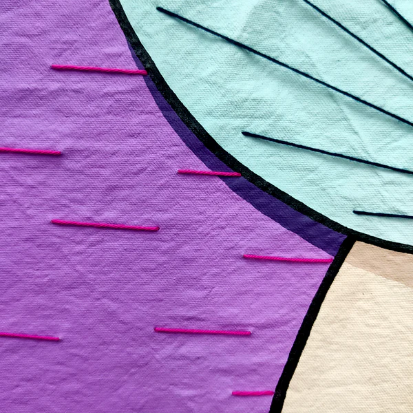 Lienzo de algodón crudo, pintura acrílica, pasteles al óleo, hilo de algodón.