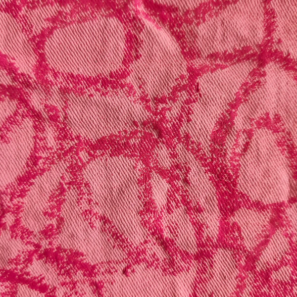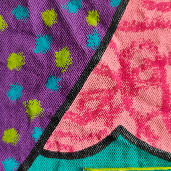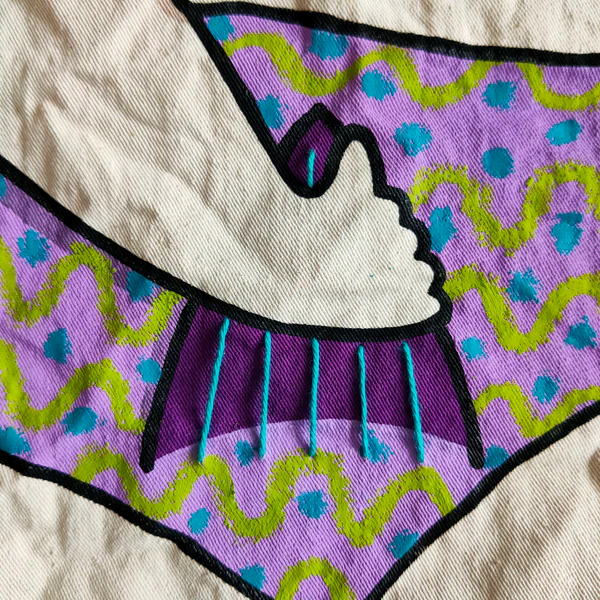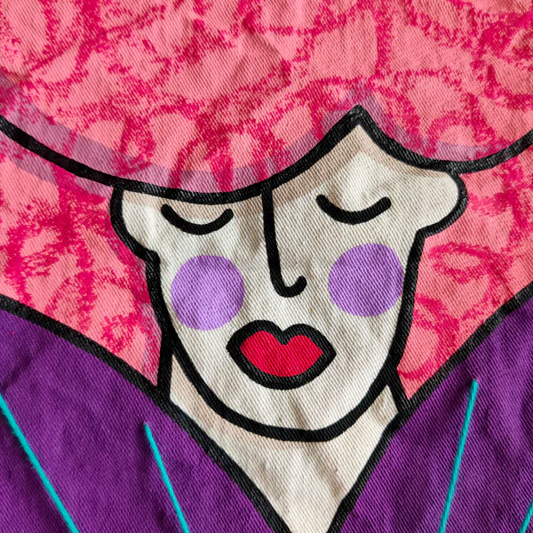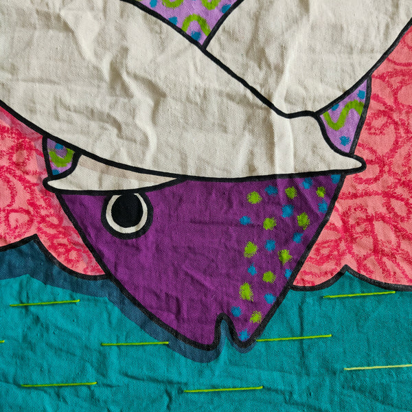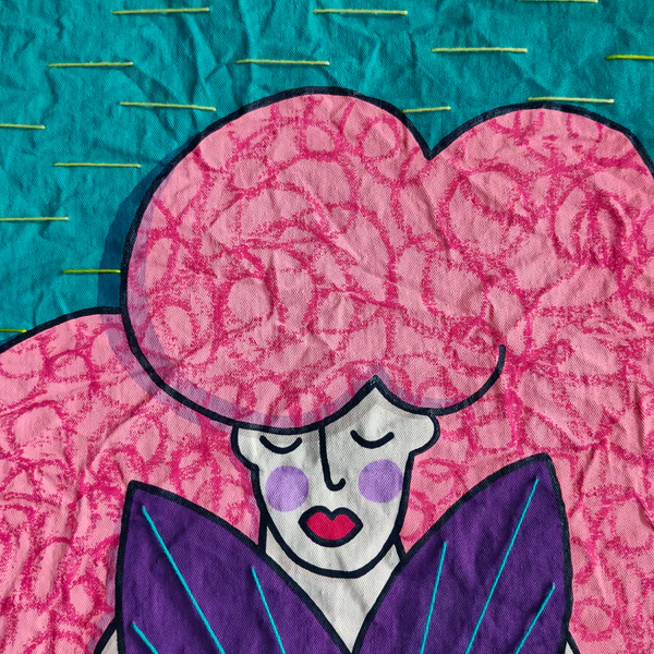 Lienzo de algodón crudo, pintura acrílica, pasteles al óleo, hilo de algodón.